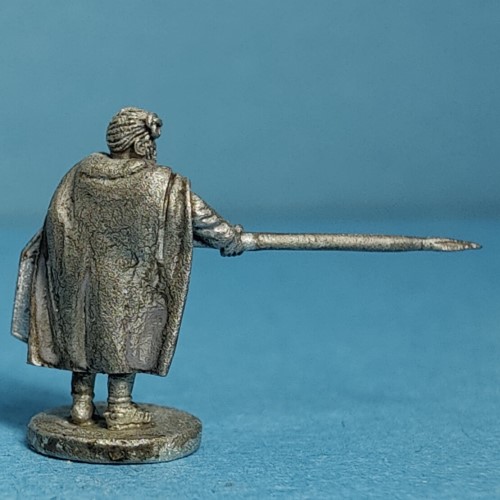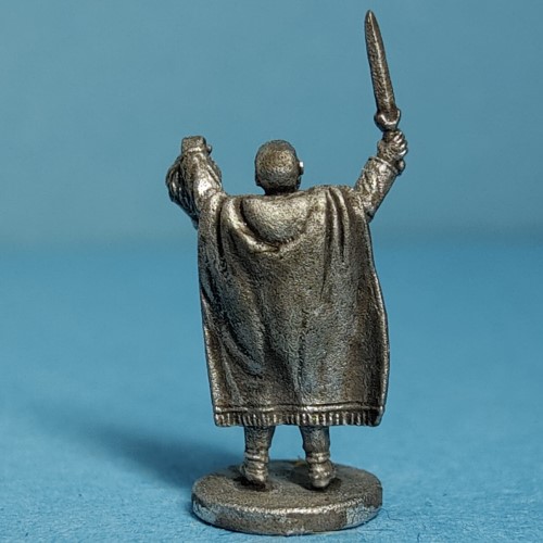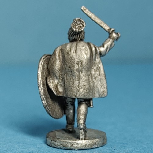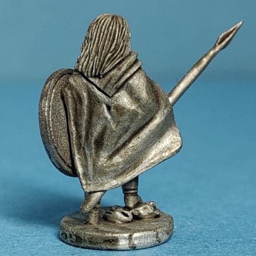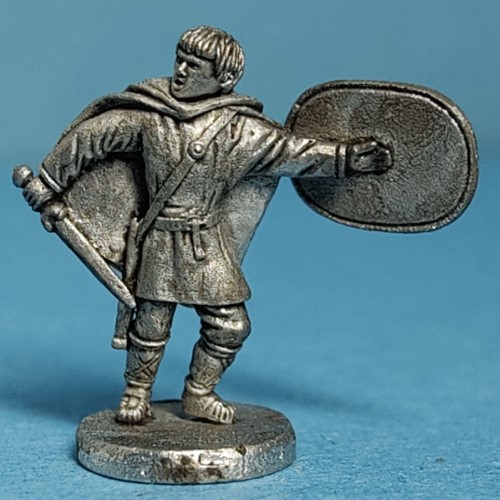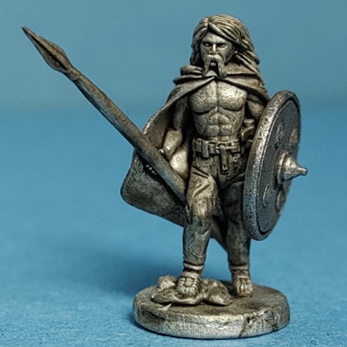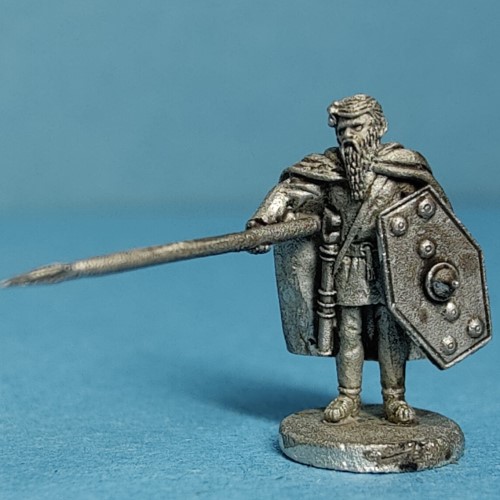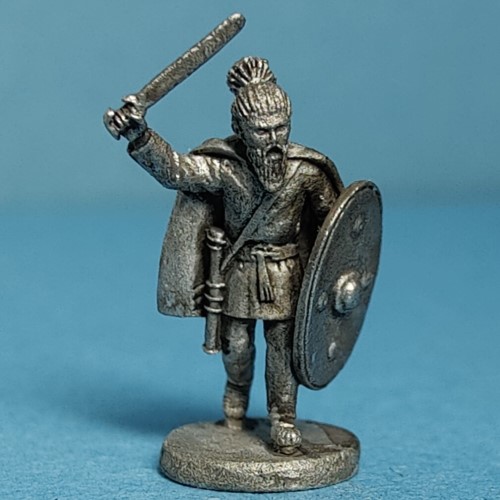 Description: This warlord leads his warriors into battle. As chieftain, he wears finer clothing, a beautifully decorated cloak, a more ornate shield and weapons of better quality.
